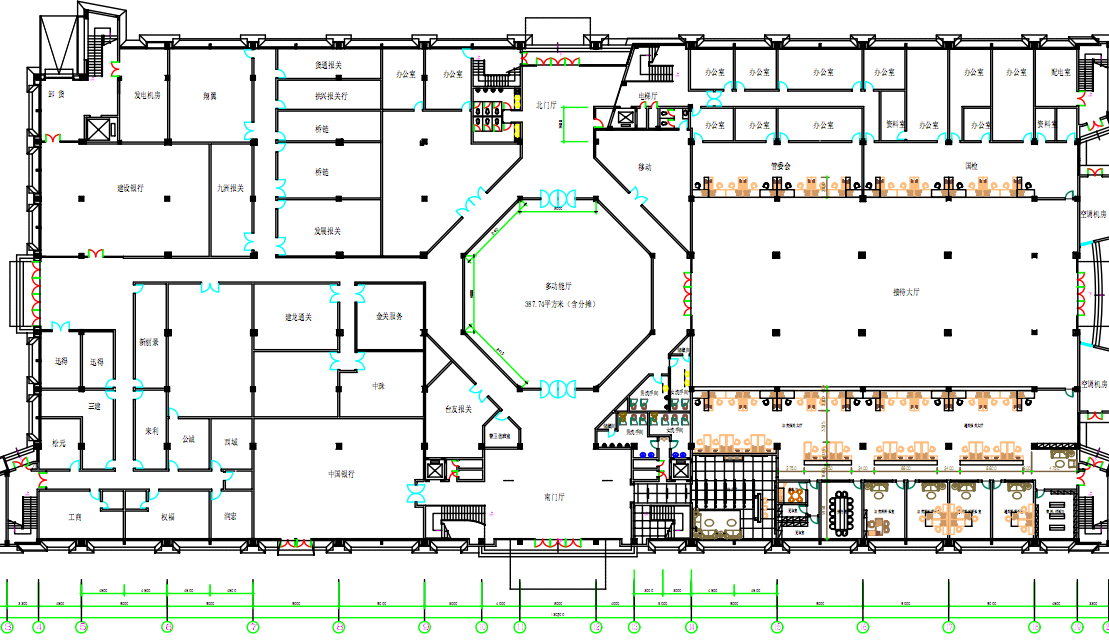 图纸中橙色、蓝色、黄色信号圈分别为1、6、11信道。圆心点为AP部署位置。