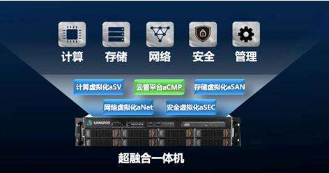 超融合架构是通过虚拟化技术,将计算、存储、网络和网络功能(安全及优化)深度融合到一台标准X86服务器中,形成标准化的超融合单元,多个超融合单元通过网络方式汇聚成数据中心整体IT基础架构,并通过统一的WEB管理平台实现可视化集中运维管理,帮助用户打造极简、随需应变、平滑演进的IT新架构。
